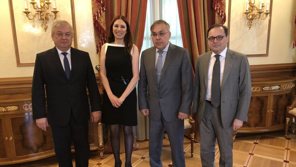 رندا قسيس مع ألكسندر لافرنتييف، المبعوث الخاص للرئيس بوتين إلى سوريا؛ وسيرغي فيرشينين، نائب وزير الخارجية؛ وفابيان بوسار